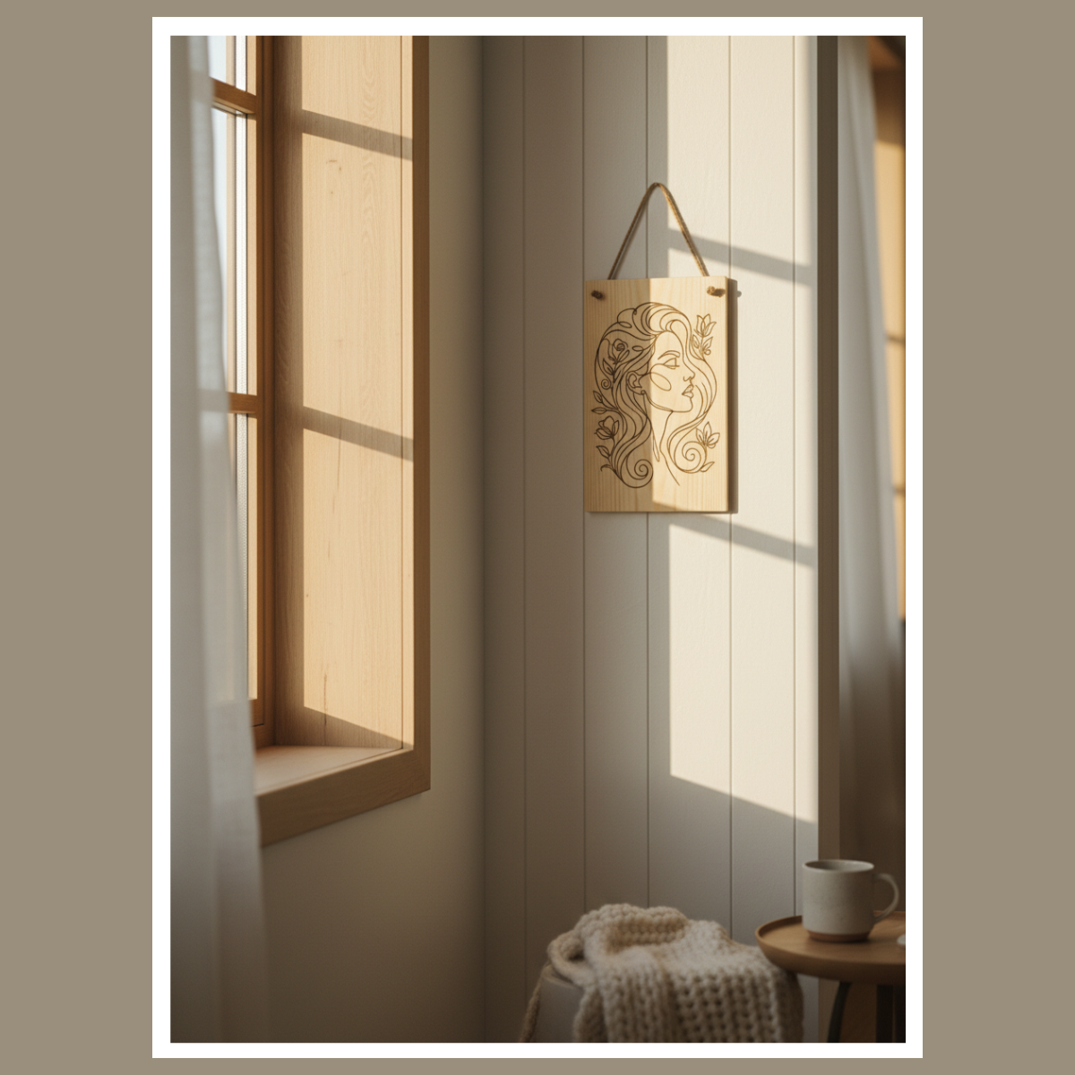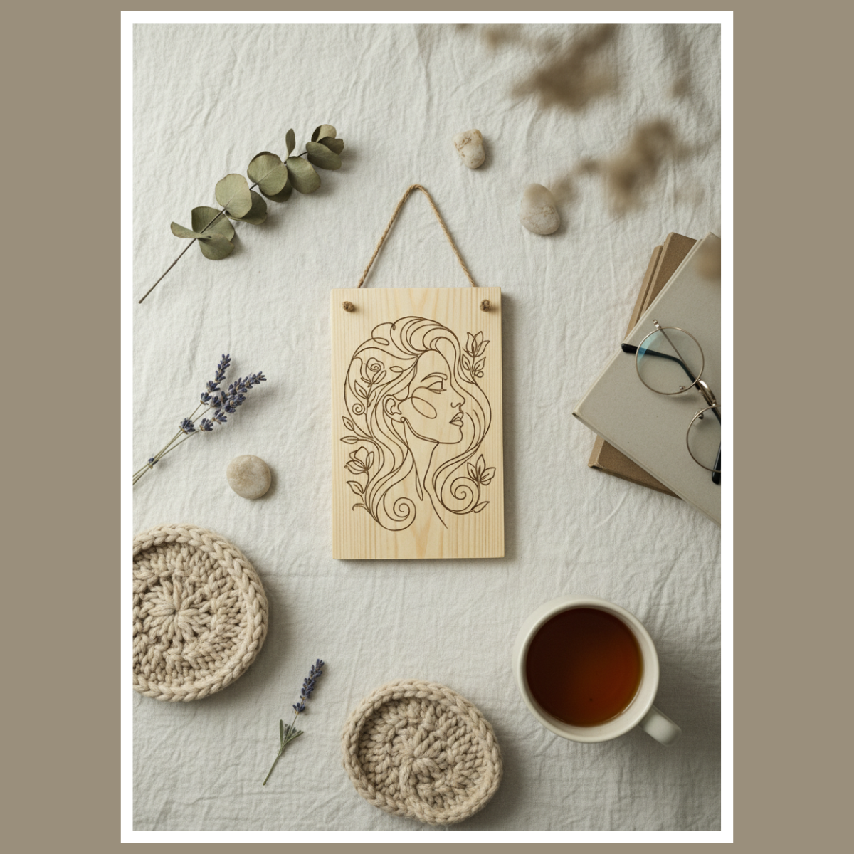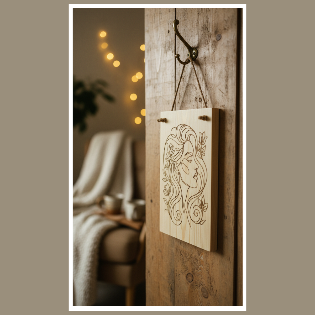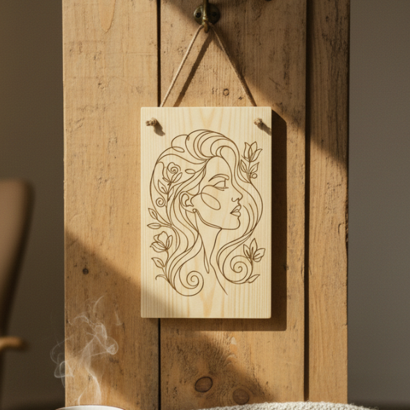 Drewniana tabliczka z grawerem kobiety to wyjątkowa dekoracja ścienna w naturalnym, spokojnym stylu. Na jasnym drewnie znajduje się precyzyjny grawer przedstawiający kobiecy profil otulony kwiatami i liśćmi. Dzięki temu tabliczka pięknie pasuje do wnętrz boho, rustykalnych, minimalistycznych i skandynawskich, a także do przytulnych przestrzeni z dodatkami z lnu, bawełny i drewna.