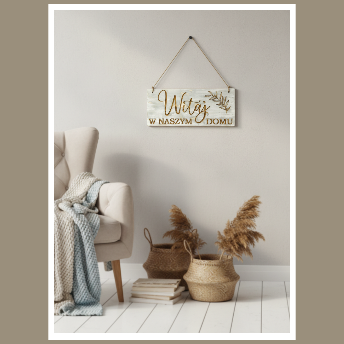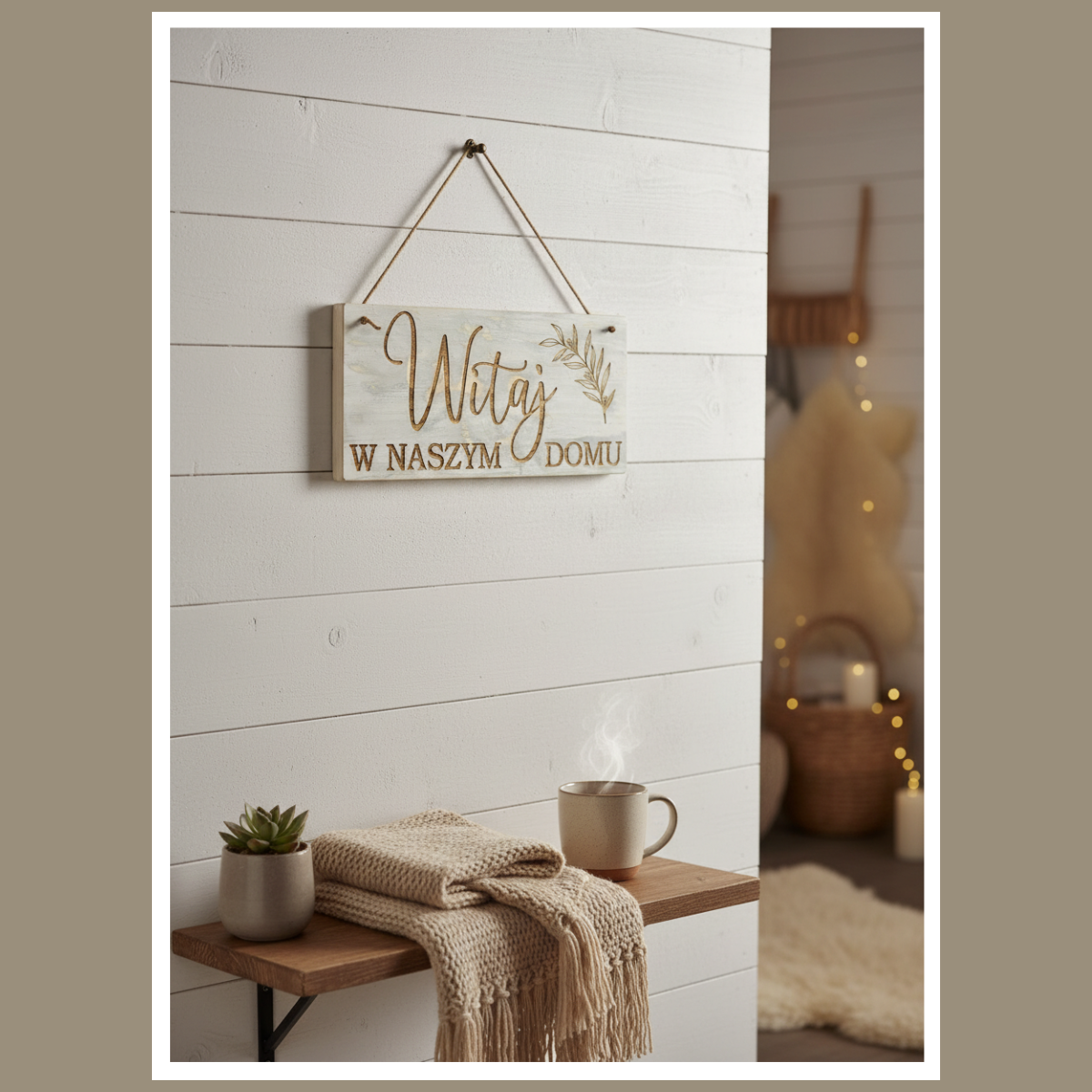 Szukasz dodatku, który od razu robi dobre pierwsze wrażenie? Drewniana tabliczka na drzwi „Witaj w naszym domu” to przytulna dekoracja wejściowa z grawerowanym napisem i delikatnym motywem roślinnym. Jest prosta, a jednocześnie efektowna, dlatego pasuje do wielu aranżacji. Co więcej, dostępna jest w dwóch wariantach: białym oraz w odcieniu starego drewna, dzięki czemu łatwo dopasujesz ją do stylu wnętrza.