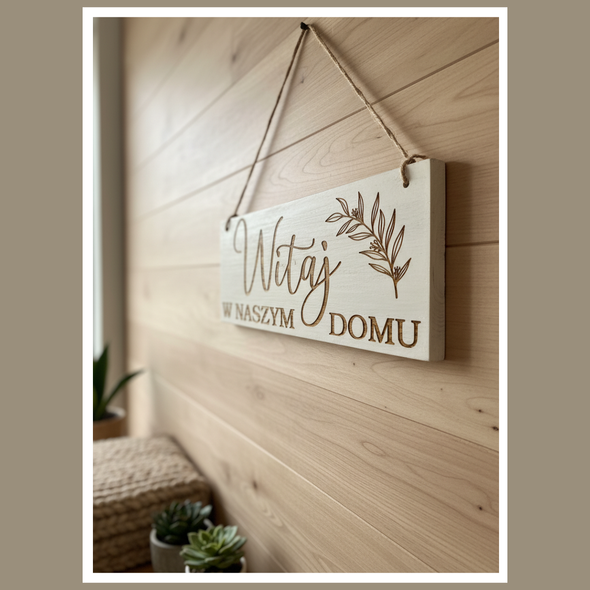 Największą zaletą jest czytelny, grawerowany napis, który od razu przyciąga uwagę. Do tego dochodzi spokojny motyw roślinny, więc całość wygląda lekko i nie dominuje przestrzeni. Wariant białej tabliczki rozjaśnia wejście, natomiast kolor starego drewna podkreśla naturalny, rustykalny charakter.