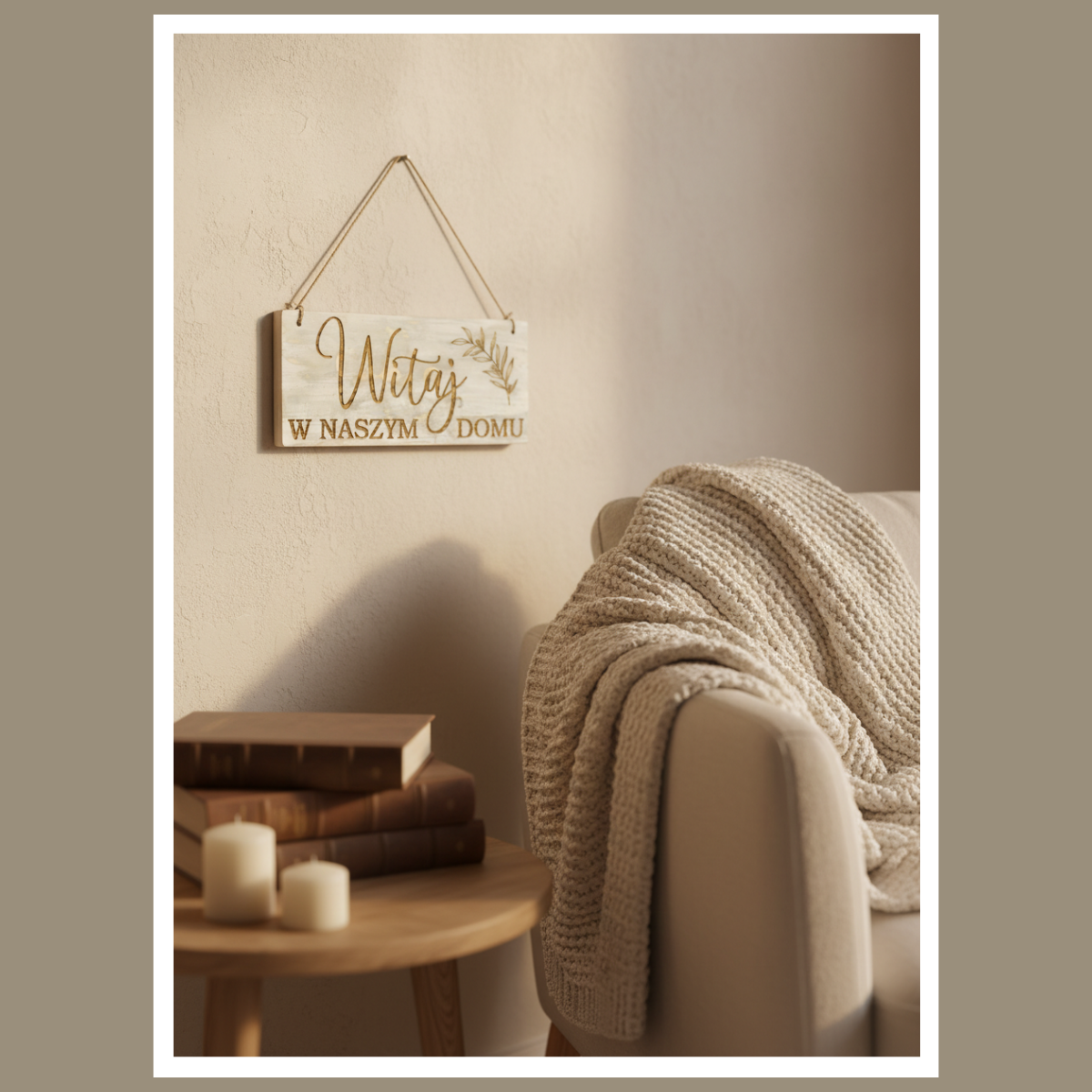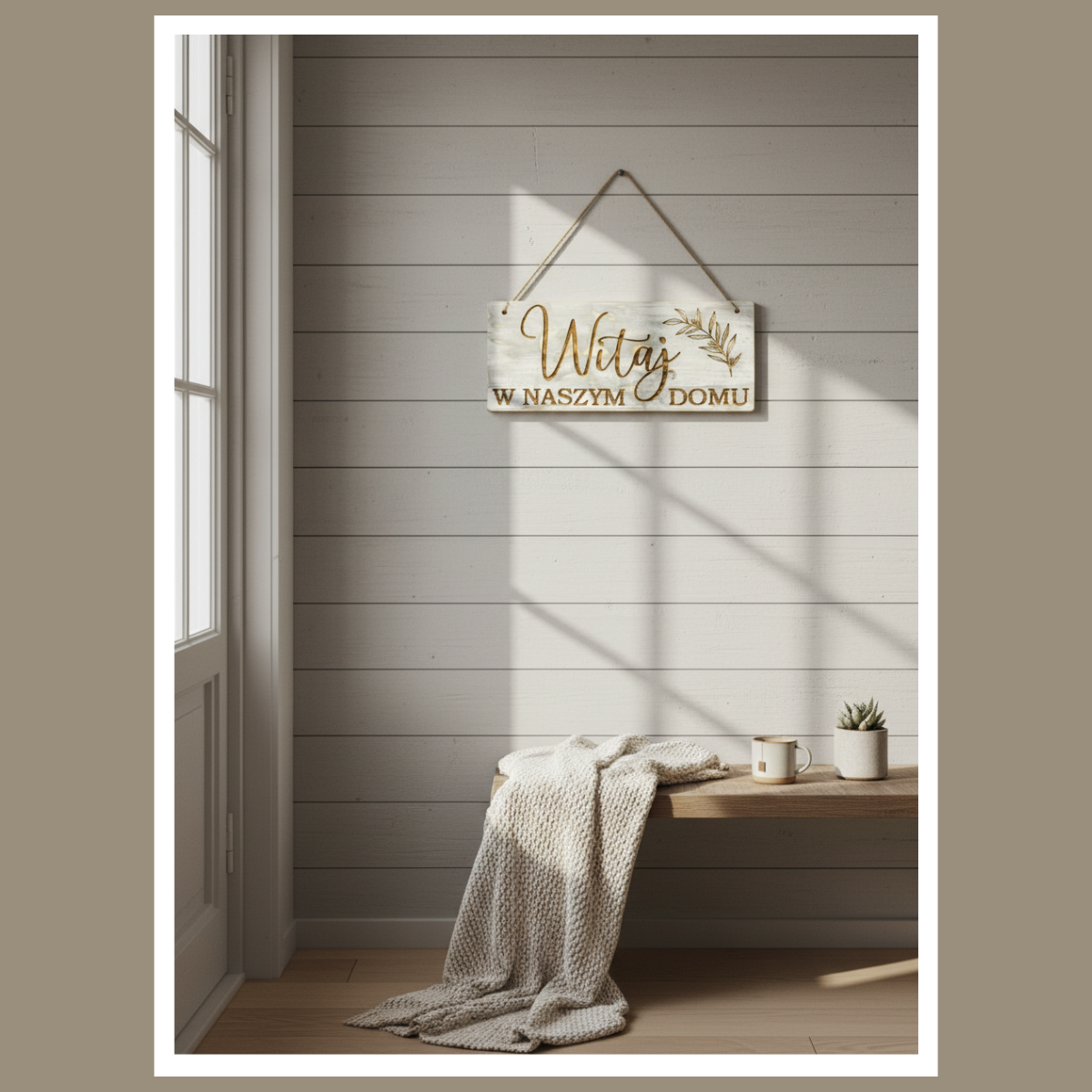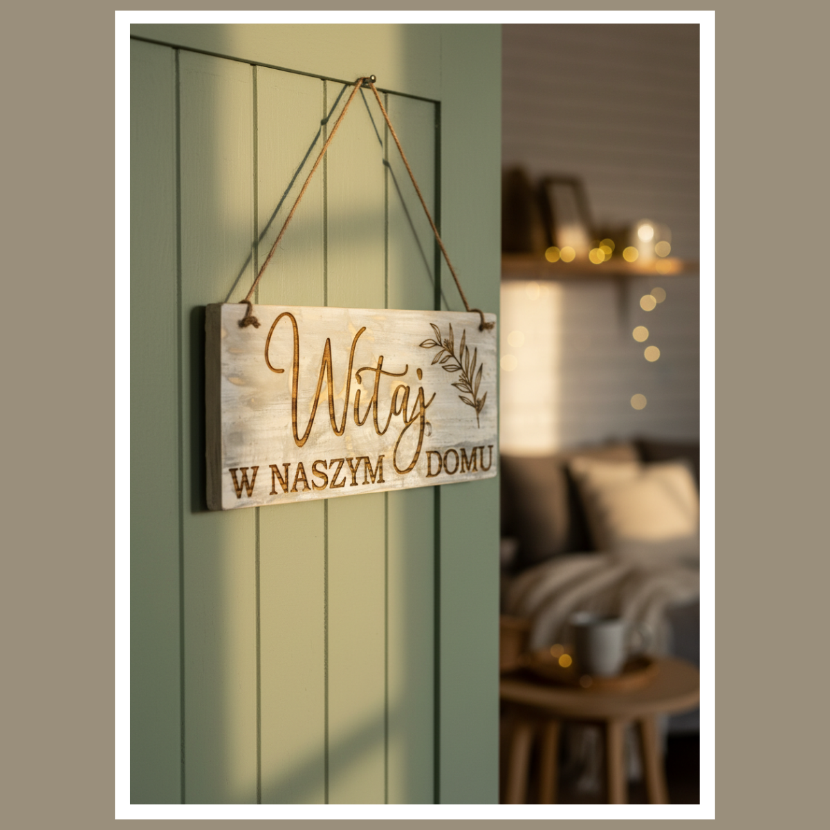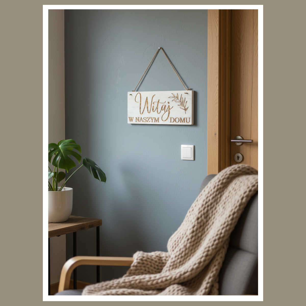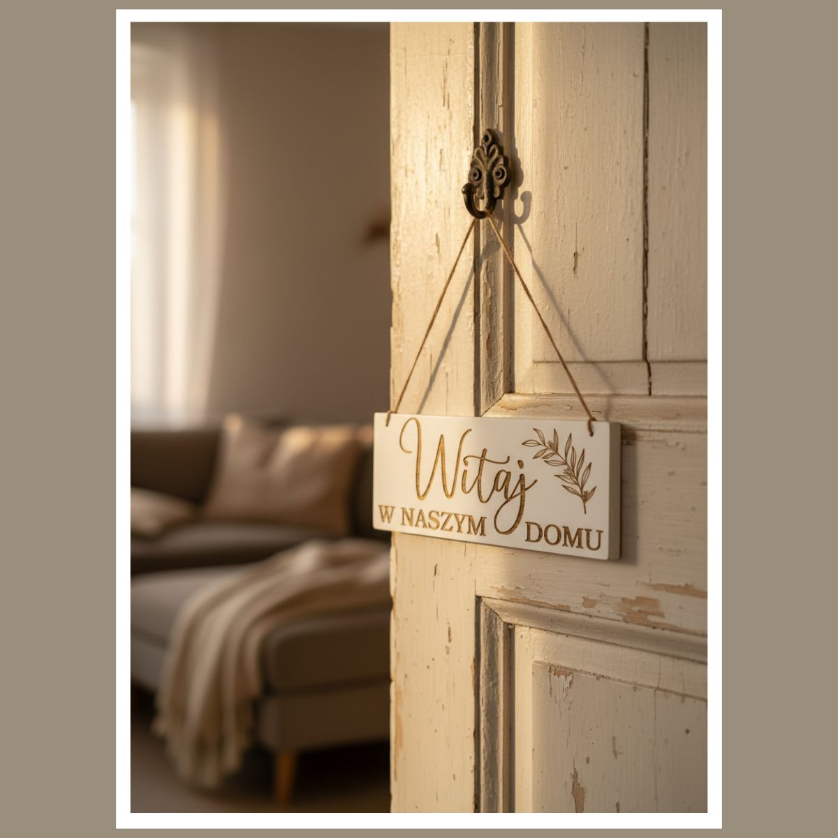 Tabliczka świetnie wygląda na drzwiach, a także na ścianie w przedpokoju lub wiatrołapie. Jeśli chcesz spójny klimat w domu, możesz powiesić ją również w korytarzu. Z kolei w apartamentach na wynajem taki detal buduje ciepłą atmosferę, dlatego goście od razu czują się mile widziani.