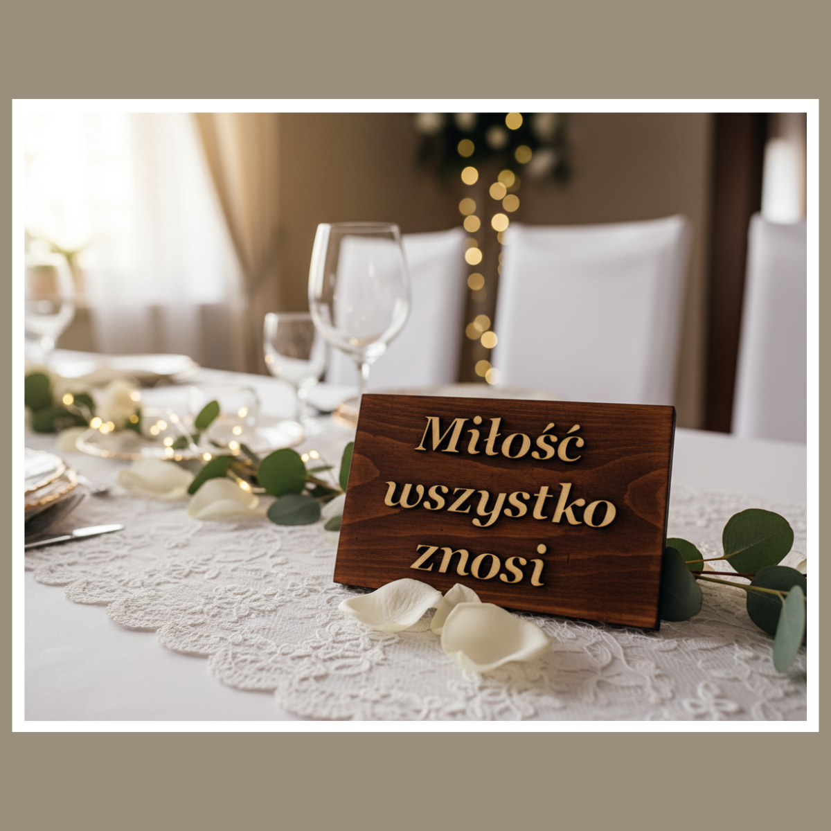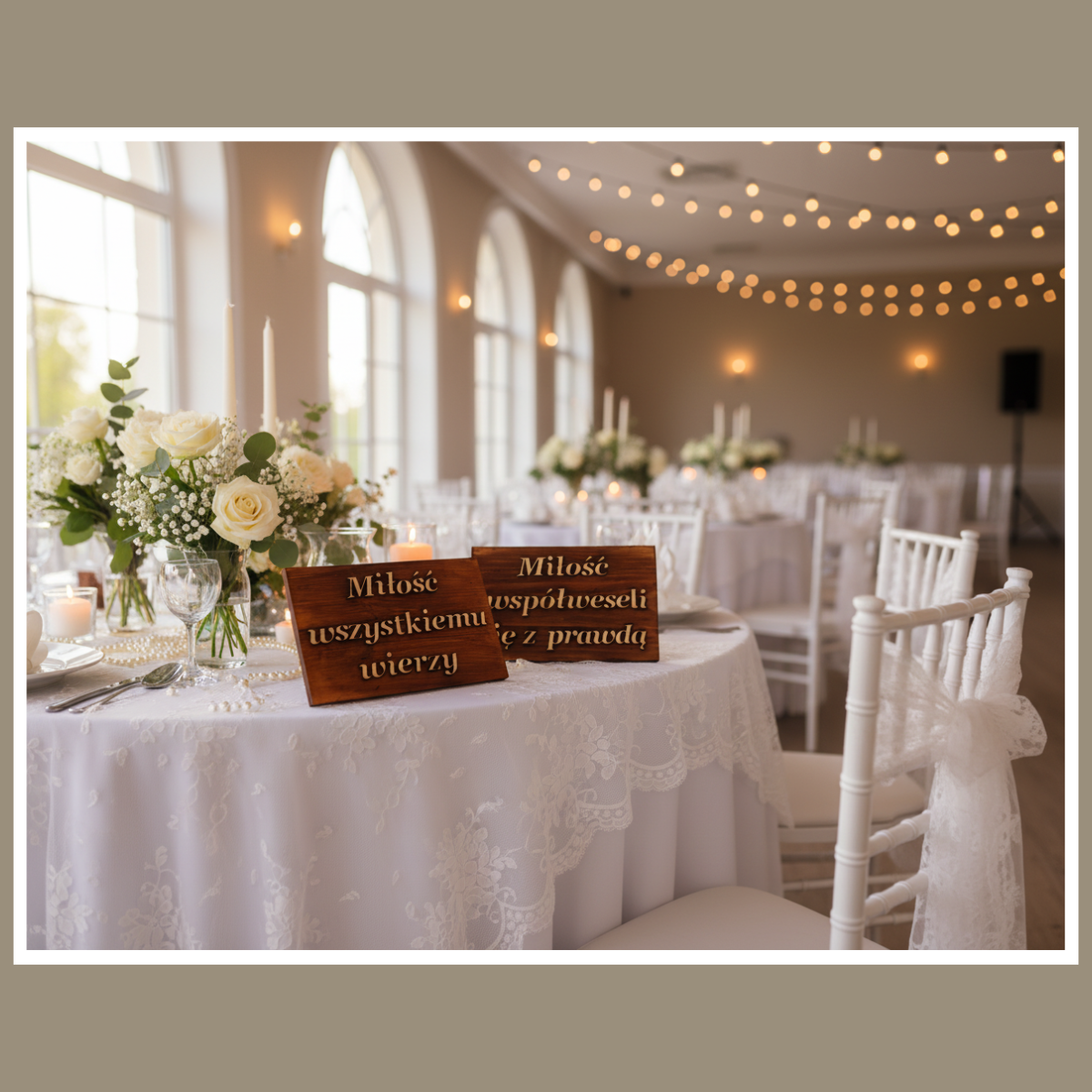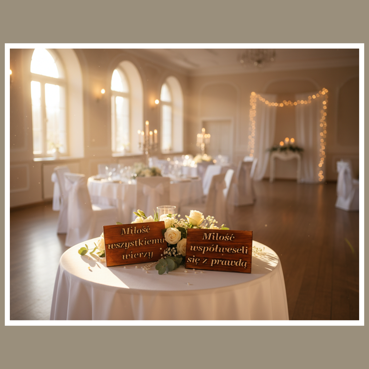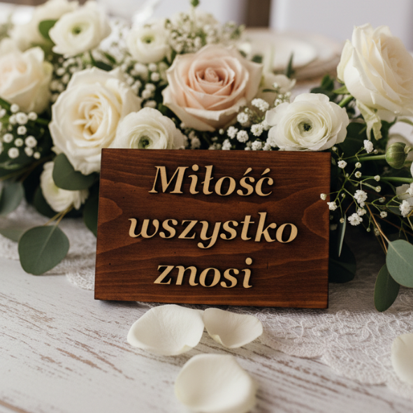 Tabliczki Hymn o Miłości to gotowy komplet dekoracji, który od razu buduje klimat. Drewno jest grube, a brązowe wykończenie wygląda ciepło i elegancko. Dlatego tabliczki pięknie prezentują się zarówno w sali, jak i w plenerze.