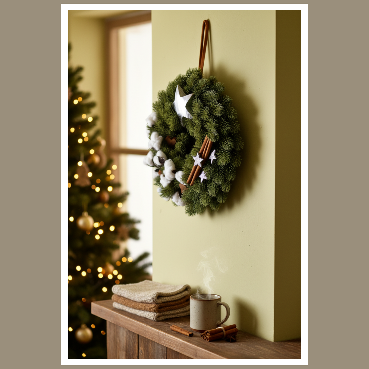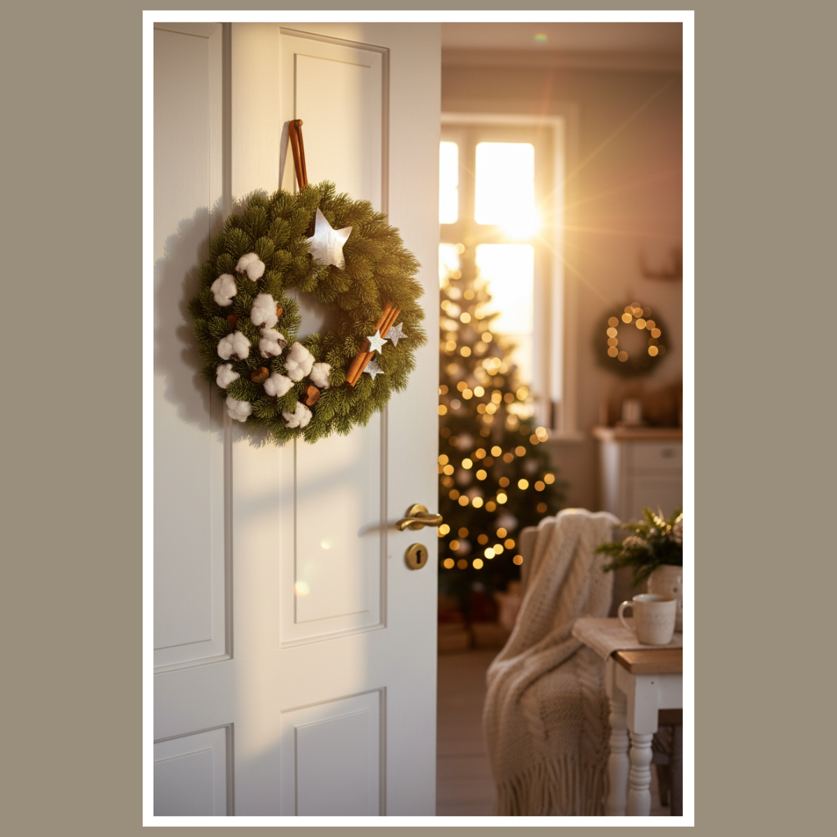 Wianek ozdobiony został drewnianymi gwiazdkami, dekoracją przypominającą bawełnę i laskami cynamonu, dzięki czemu pięknie komponuje się zarówno na drzwiach wejściowych, ścianie, jak i świątecznym stole. Idealnie pasuje do wnętrz w stylu rustykalnym, skandynawskim i naturalnym.