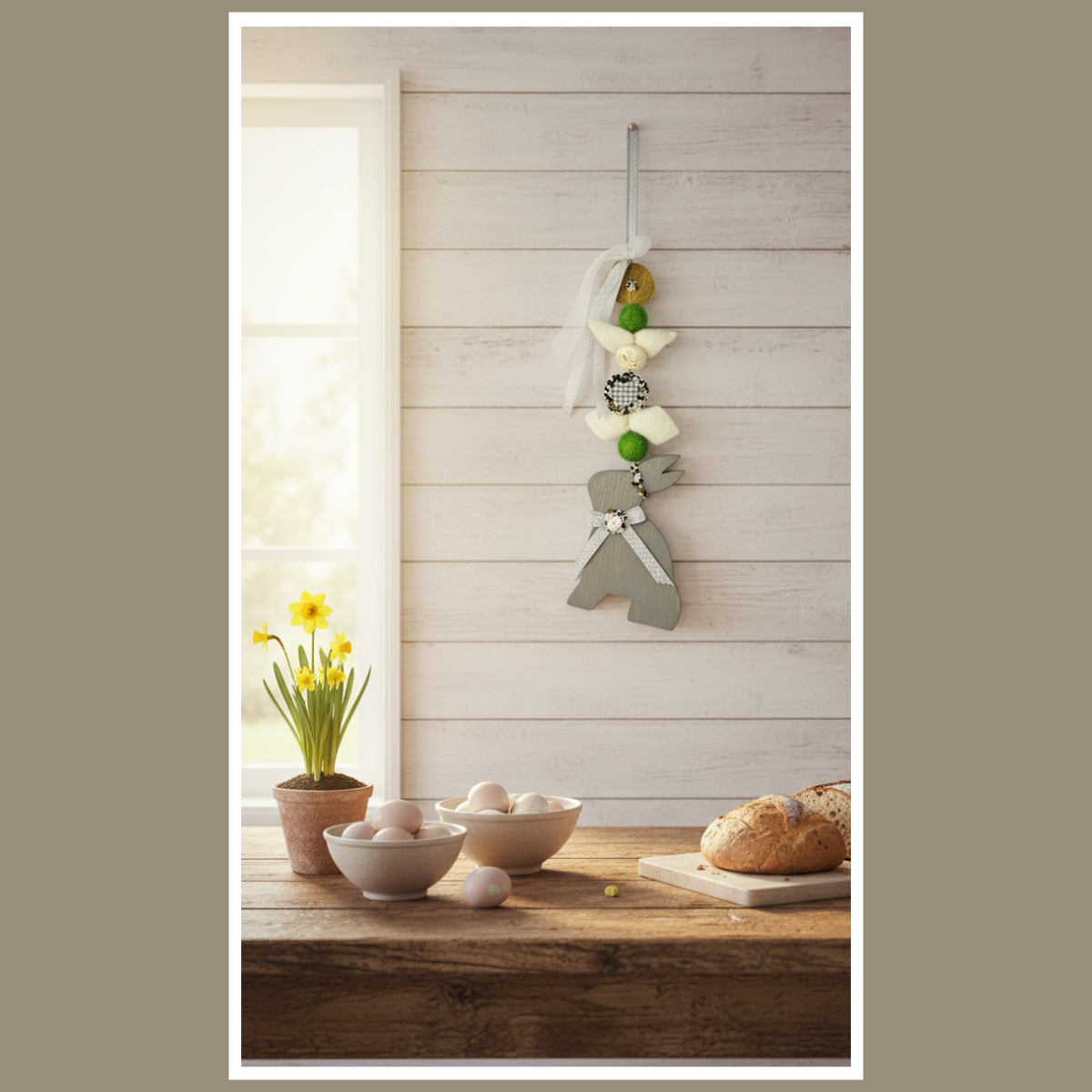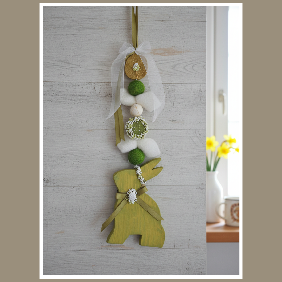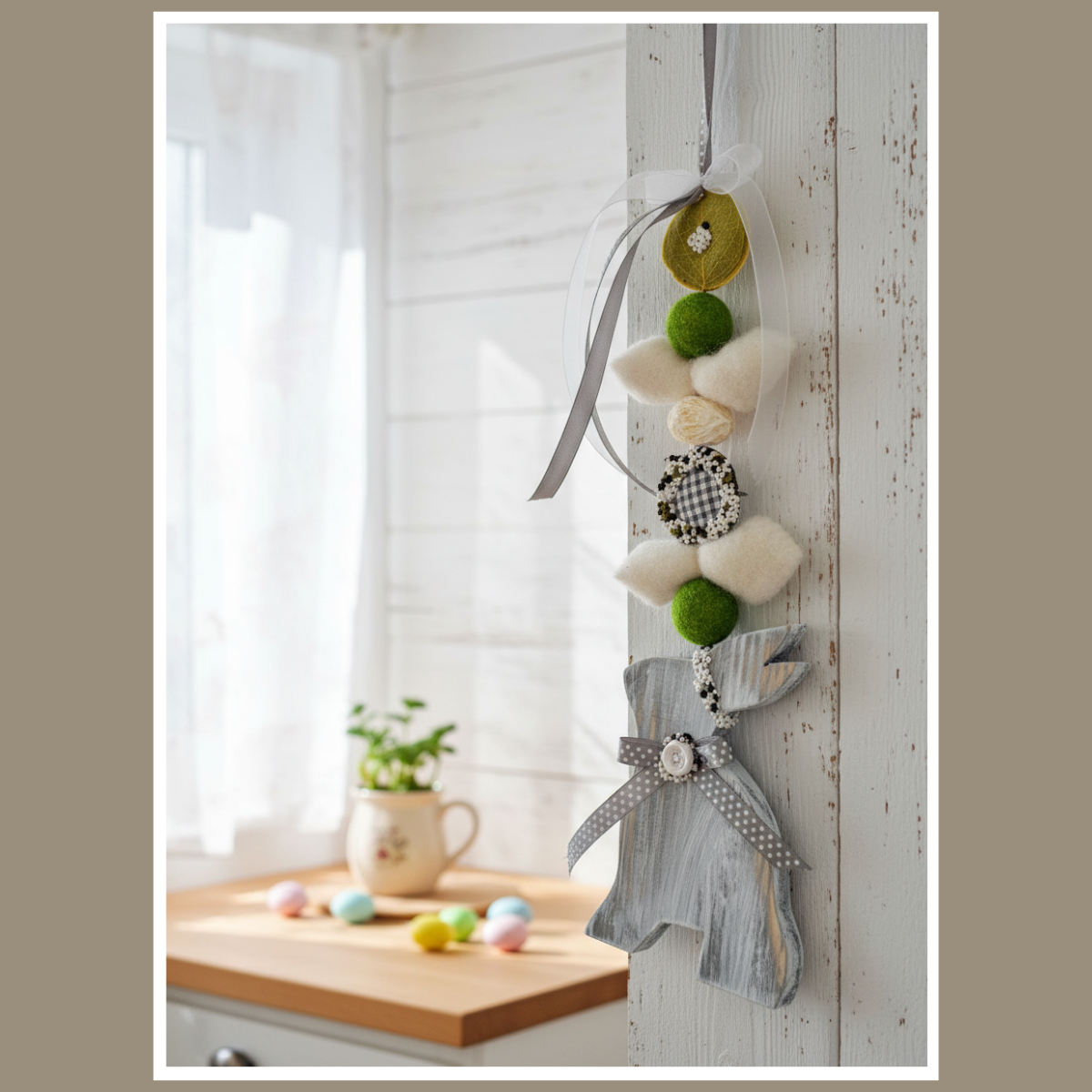 Wisząca dekoracja wielkanocna z zającem to lekka ozdoba, która od razu wprowadza wiosenny klimat. Jest dostępna w 5 kolorach: biały, zielony, przecierany szary, ciemny szary i brązowy. Możesz zawiesić ją na drzwiach, przy oknie lub na ścianie.