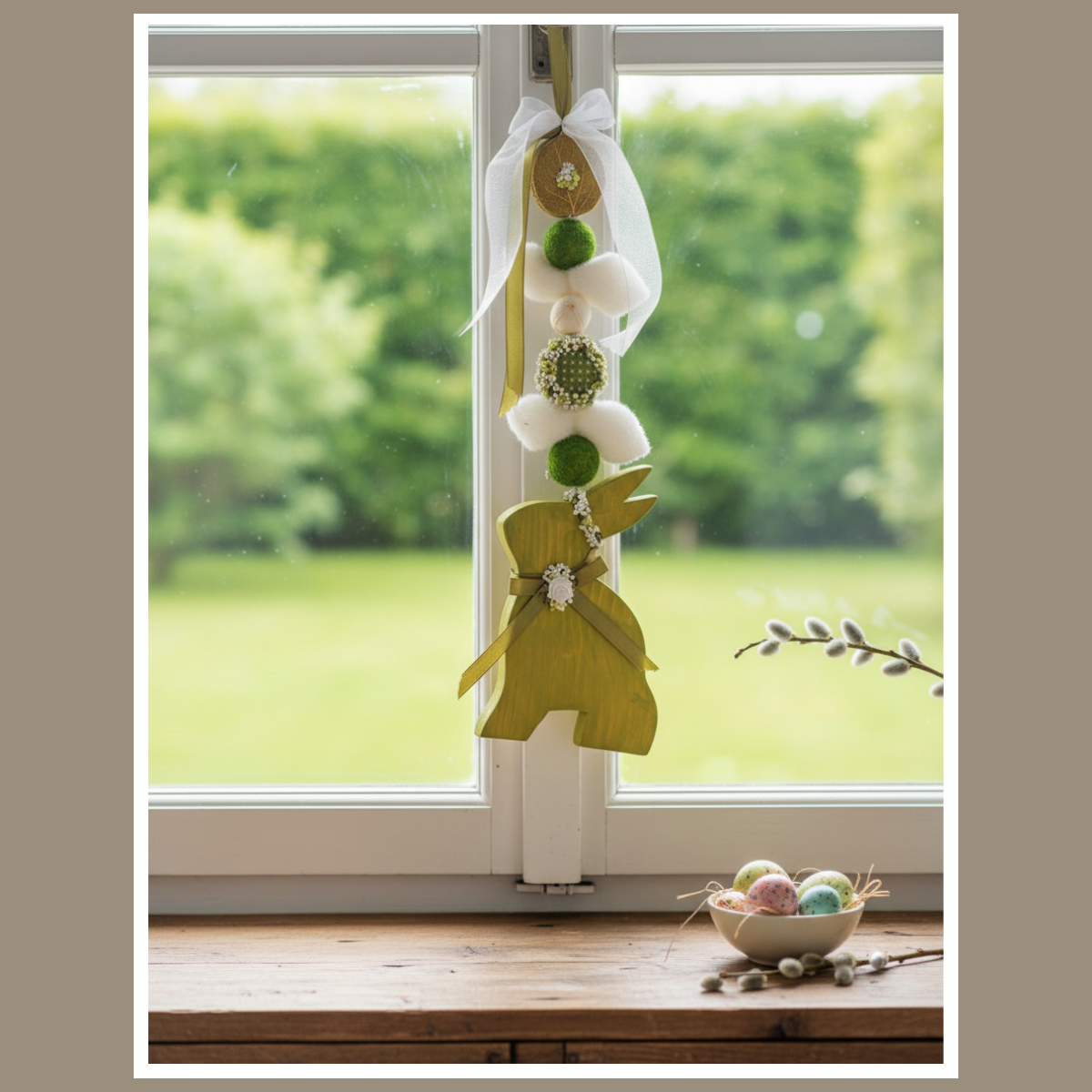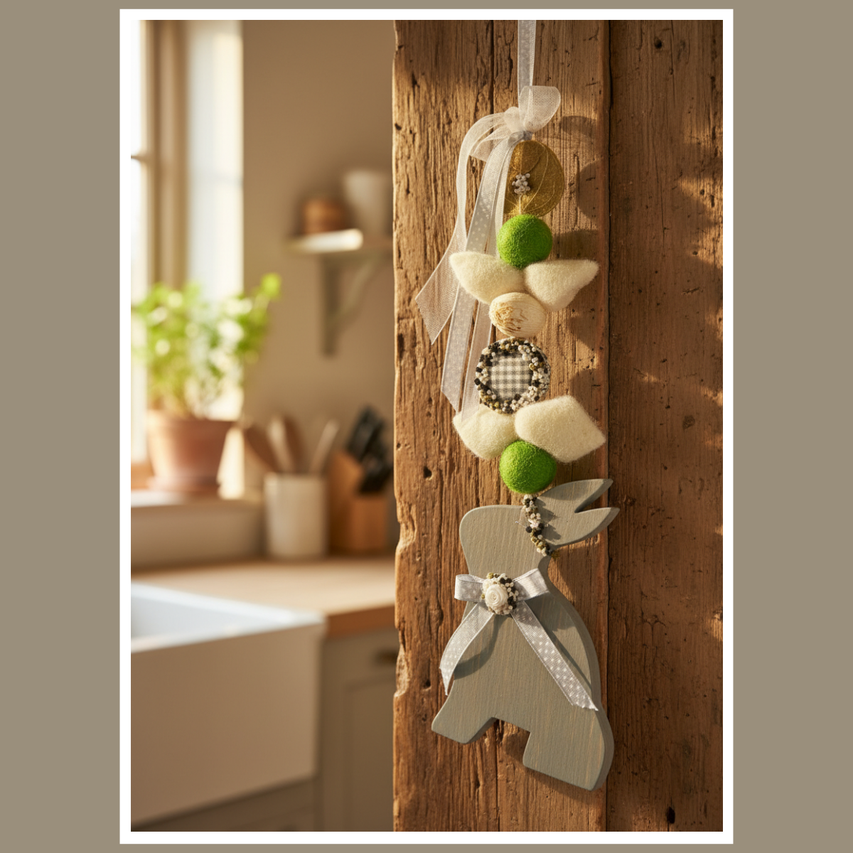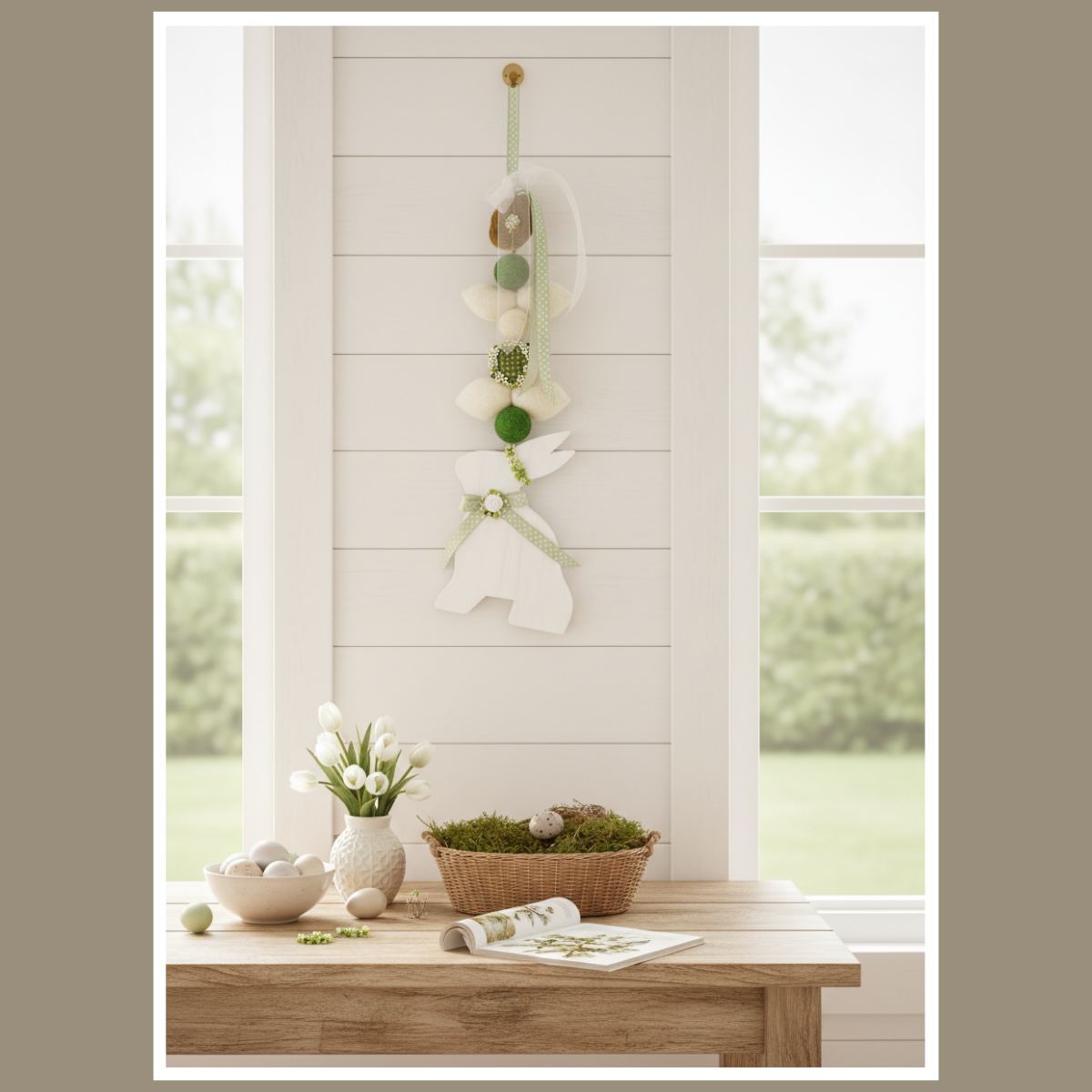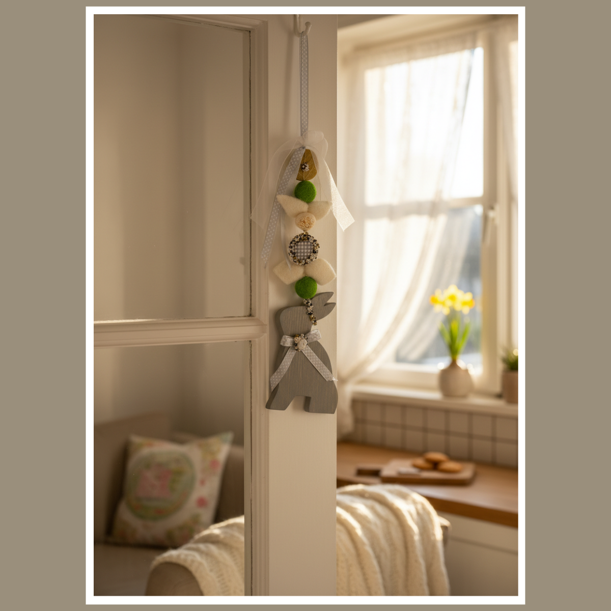 Wisząca dekoracja wielkanocna z zającem to lekka ozdoba, która od razu wprowadza wiosenny klimat. Jest dostępna w 5 kolorach: biały, zielony, przecierany szary, ciemny szary i brązowy. Możesz zawiesić ją na drzwiach, przy oknie lub na ścianie.