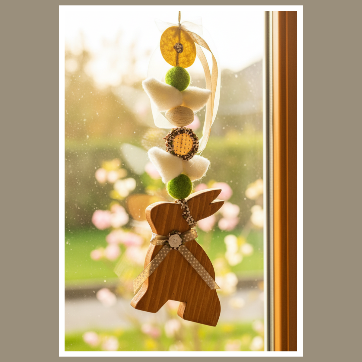 Wisząca dekoracja wielkanocna z zającem to nasza charakterystyczna forma rękodzieła. Jest delikatna, a jednak przyciąga spojrzenia. Zawieszka łączy drewnianą sylwetkę zająca z dekoracyjnymi dodatkami, dlatego całość wygląda naturalnie i przytulnie.