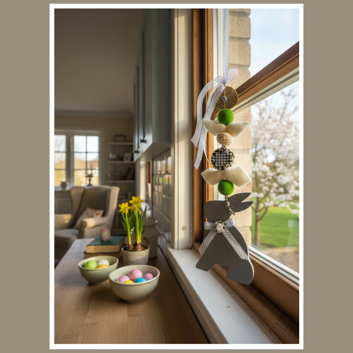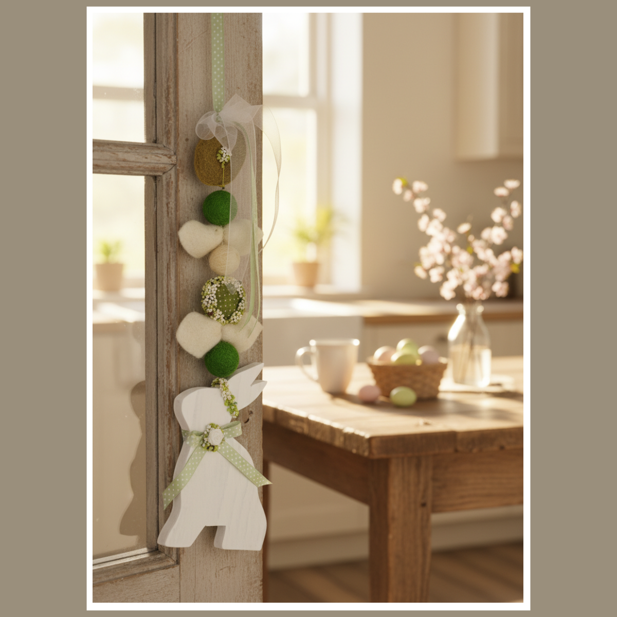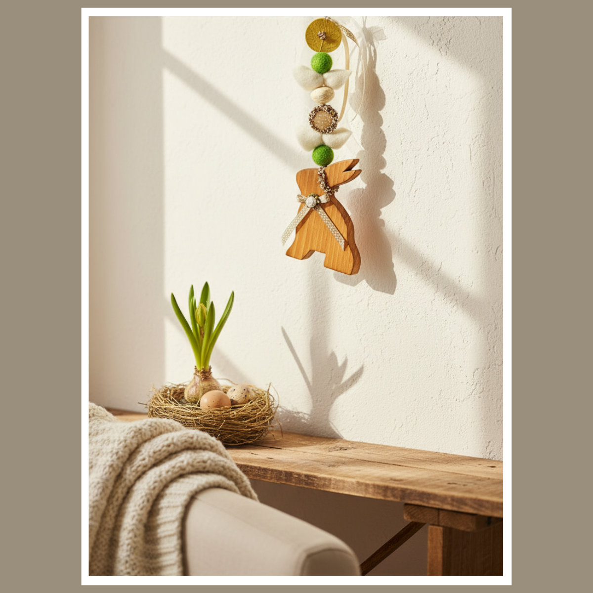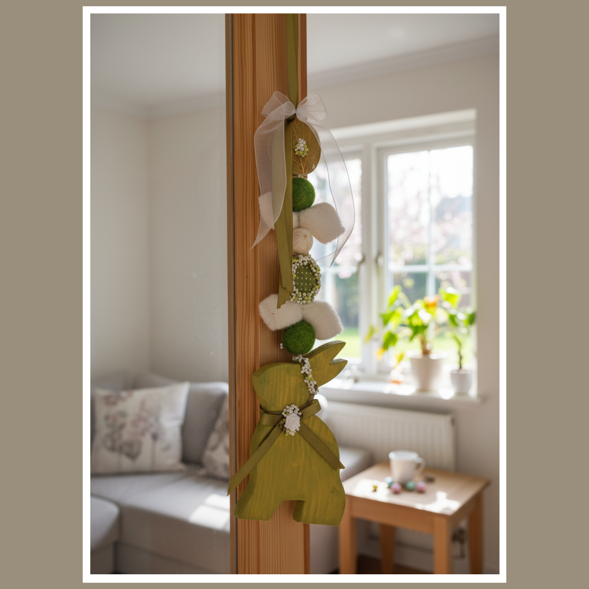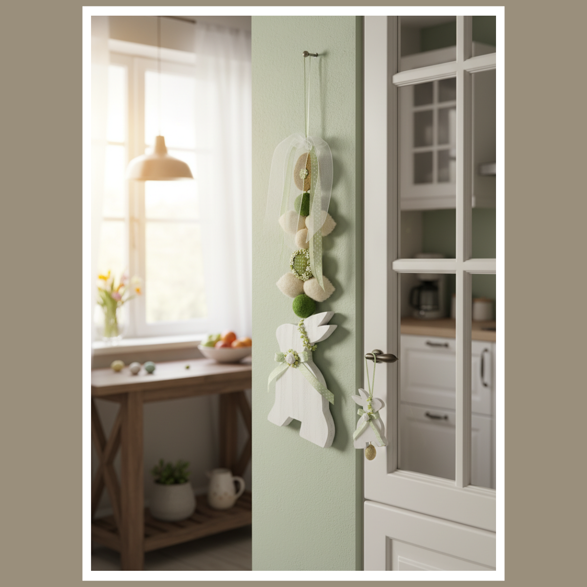 Jeśli lubisz spójne dodatki, połącz ją z gałązkami bazi, a także z ceramiką i lnianymi tekstyliami. Dodaj wiosenne kwiaty, dlatego całość będzie wyglądać świeżo i lekko. Natomiast w przedpokoju zawieszka od razu buduje świąteczny nastrój.