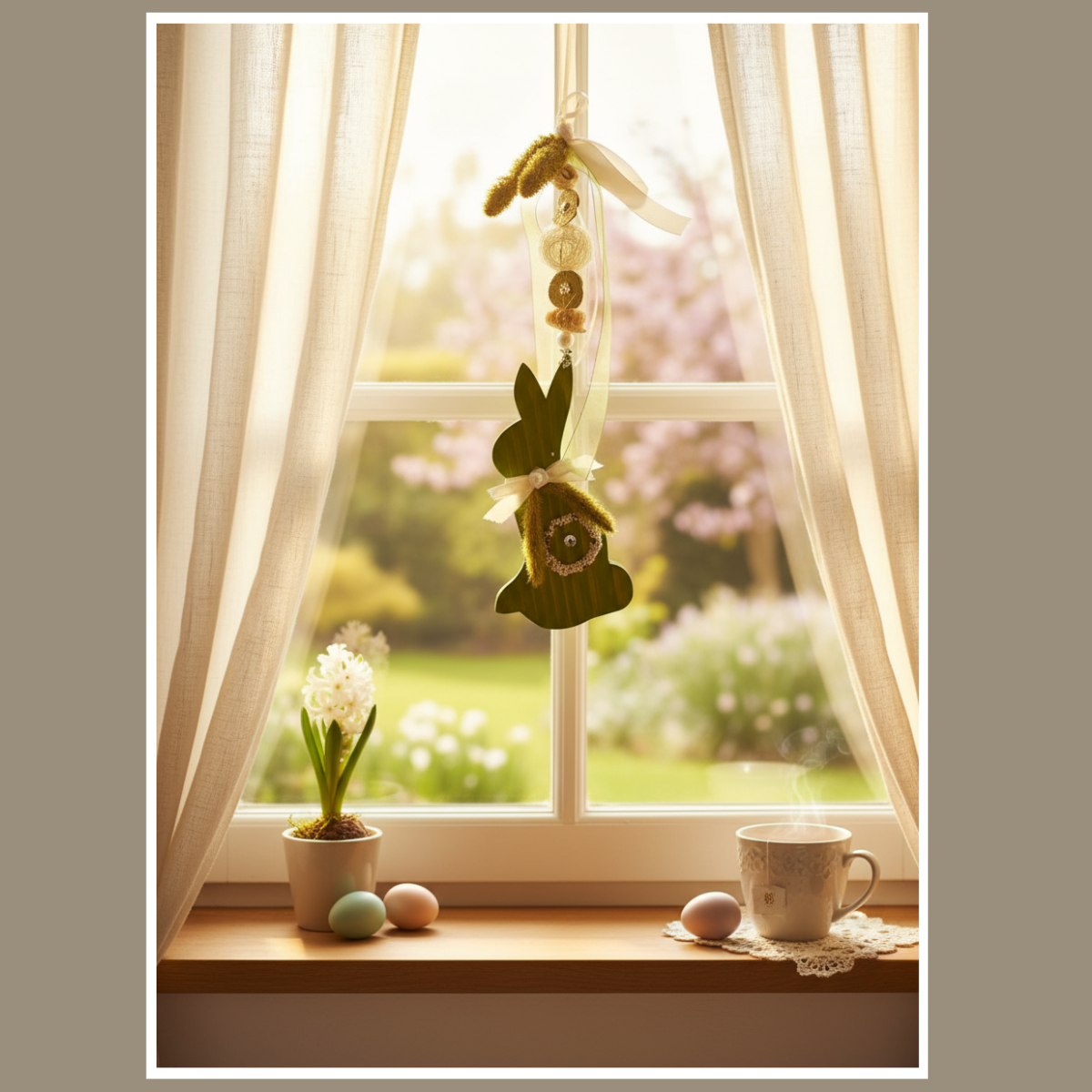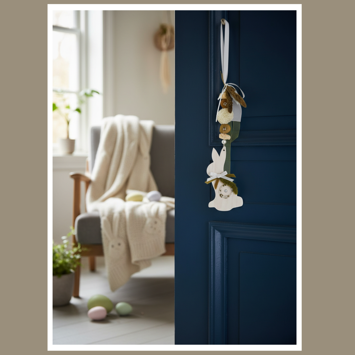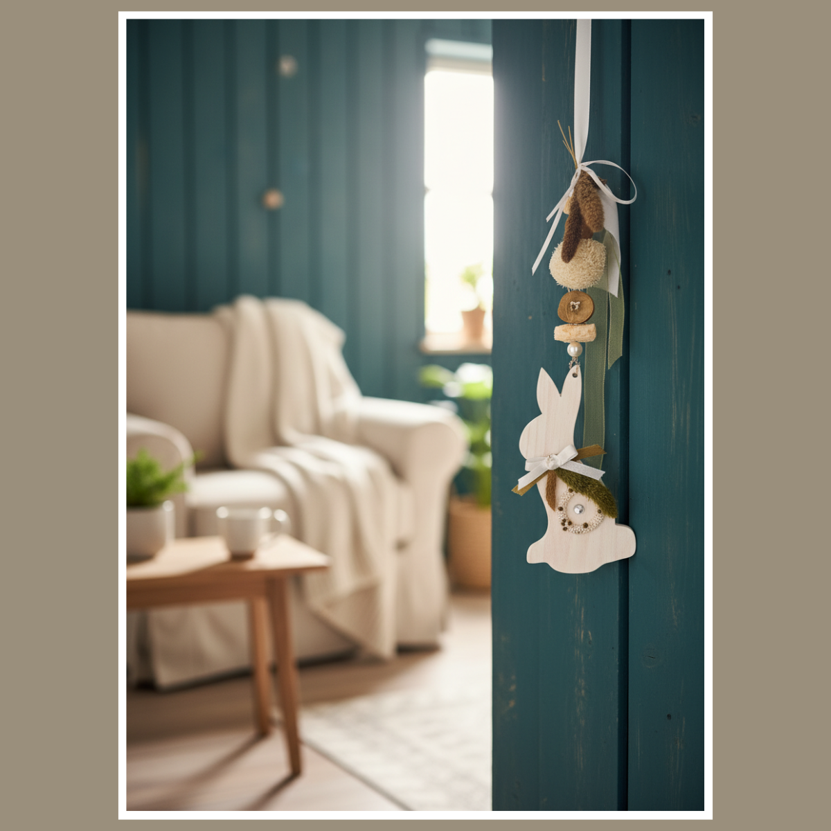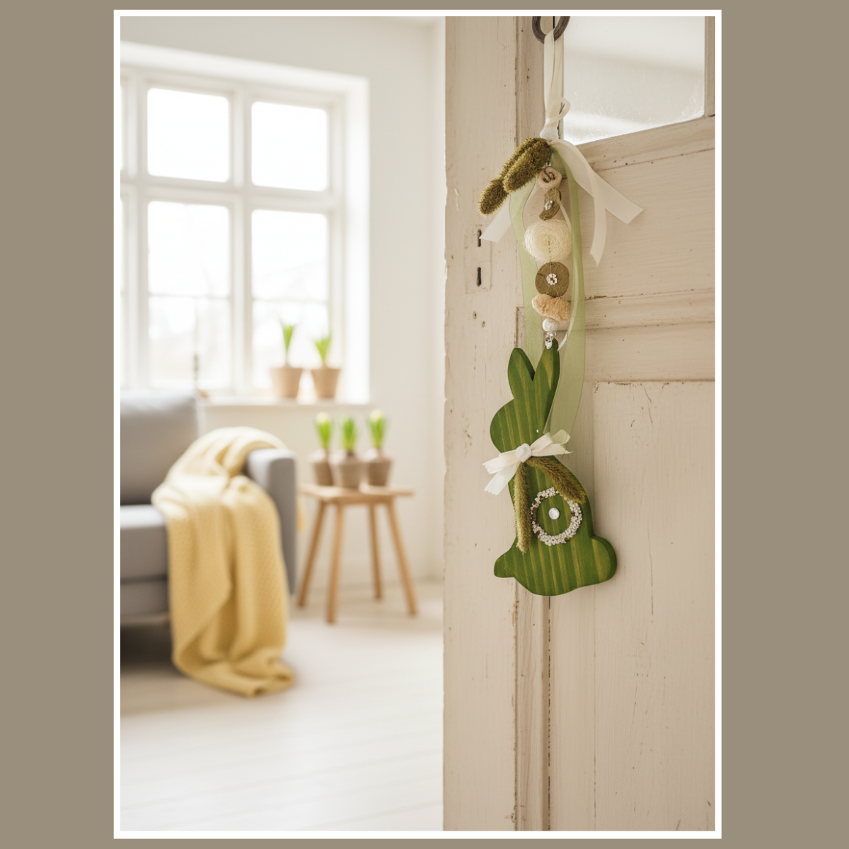 Biały drewniany zajączek tworzy spokojne tło, a zielone akcenty dodają wiosennej energii. Całość jest lekka wizualnie, dlatego dobrze łączy się z jasnymi zasłonami, drewnem, lnem i naturalnymi tkaninami. Jeśli lubisz spójne aranżacje, możesz dobrać do niej inne ozdoby w podobnym klimacie i stworzyć jednolitą wiosenną kompozycję w domu.