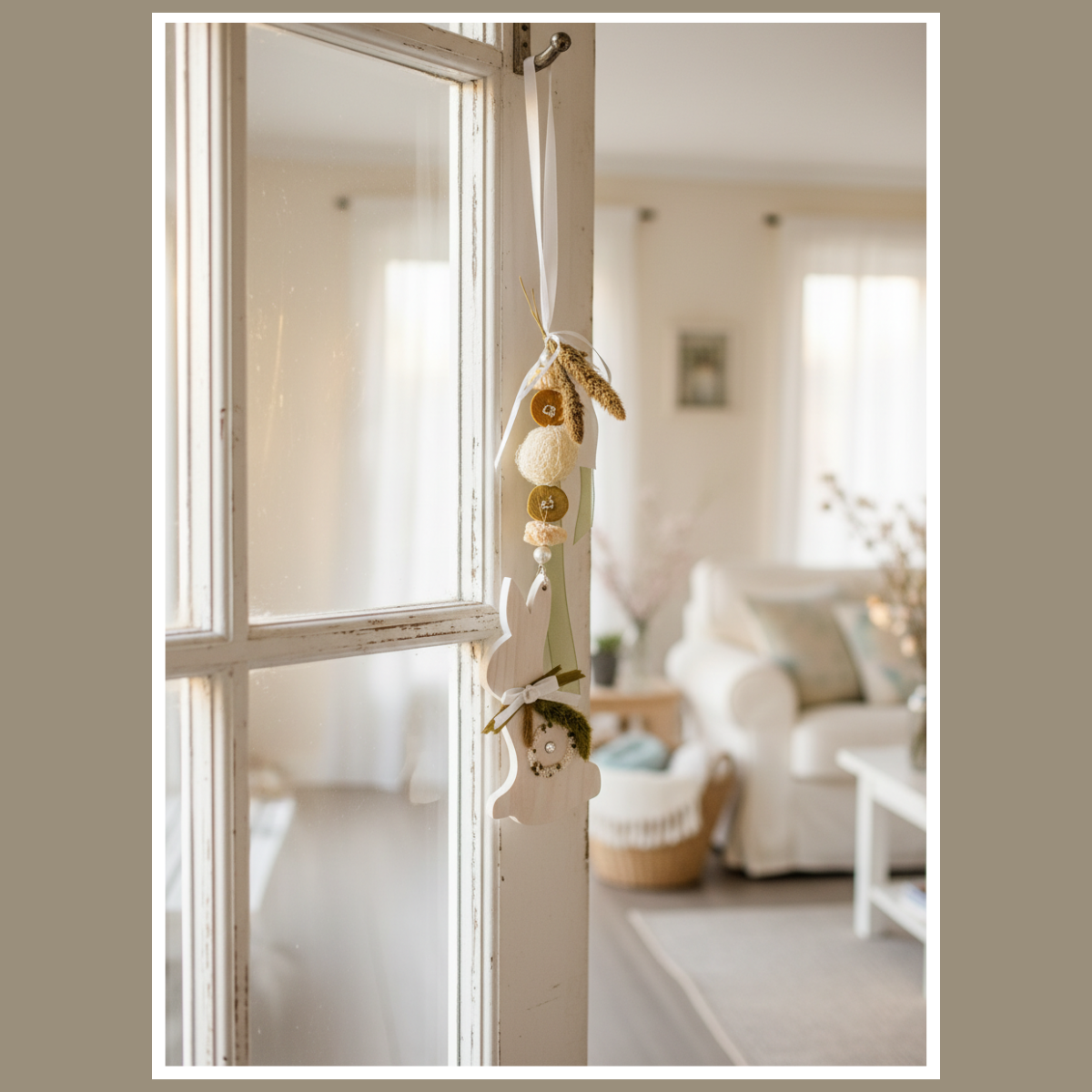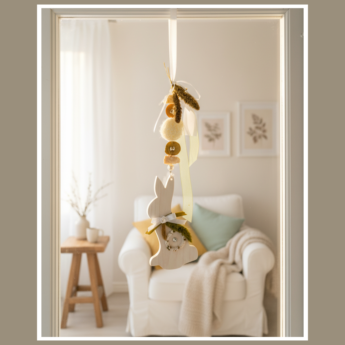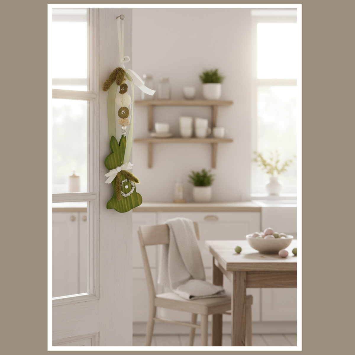 Dekoracja wielkanocna z zajączkiem w kolorach bieli i zieleni to lekka, subtelna ozdoba do zawieszenia na oknie, drzwiach lub ścianie. Drewniany zajączek, naturalne dodatki i spokojna kolorystyka tworzą przytulny, wiosenny klimat w domu.