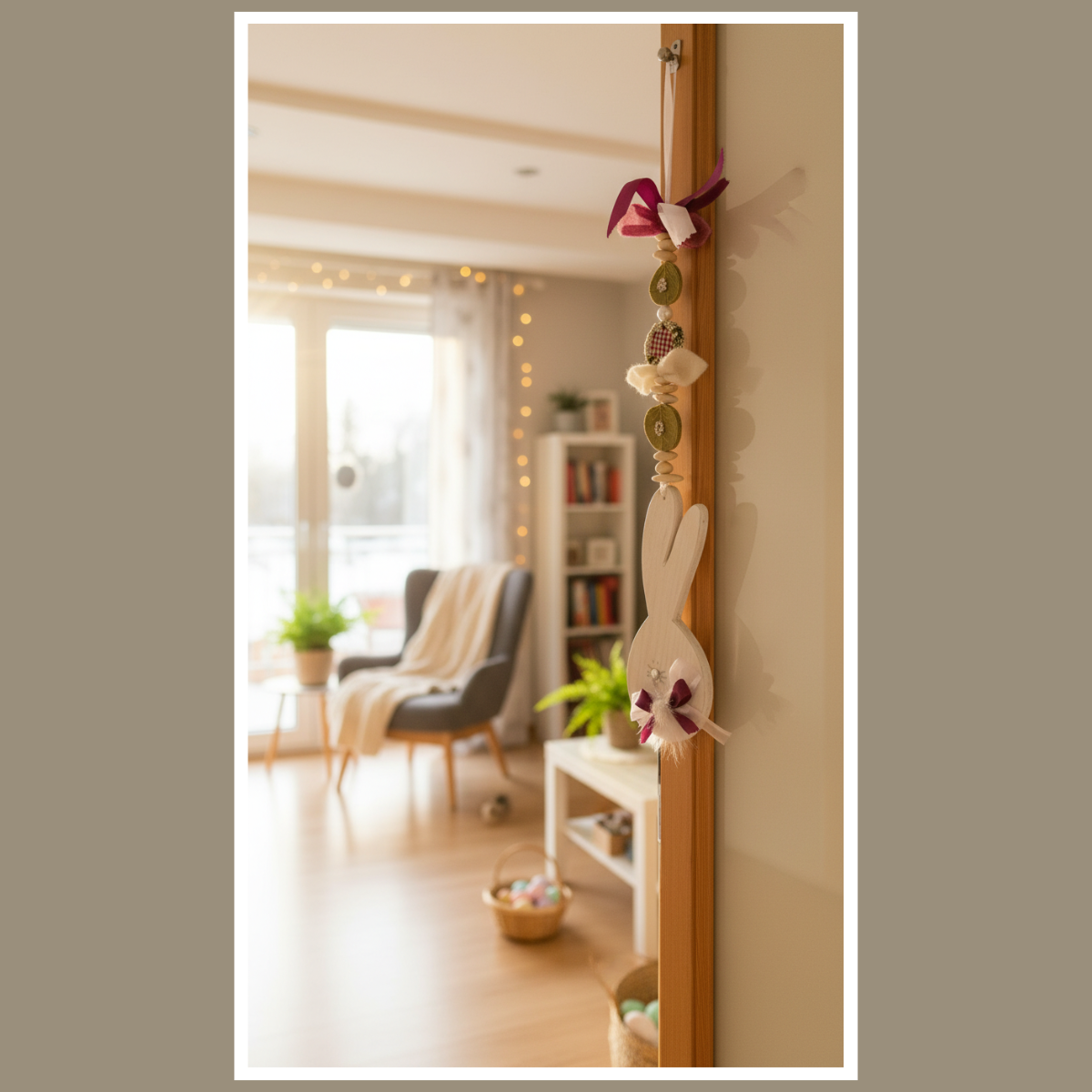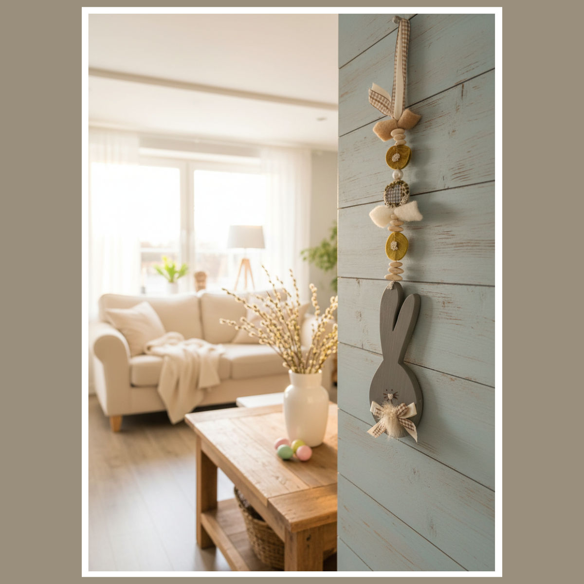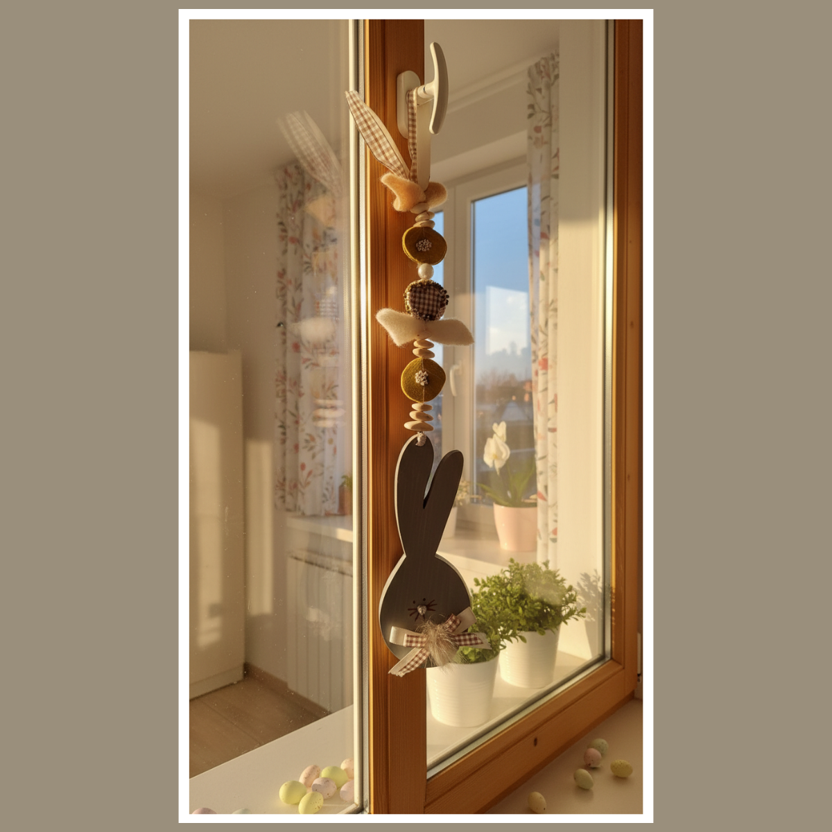 W tej dekoracji główną rolę gra drewniany zajączek. Towarzyszą mu koraliki, elementy drewniane oraz miękkie dodatki. Dzięki temu całość wygląda przytulnie. Co więcej, ozdoba pięknie pracuje w świetle, gdy wisi przy oknie.