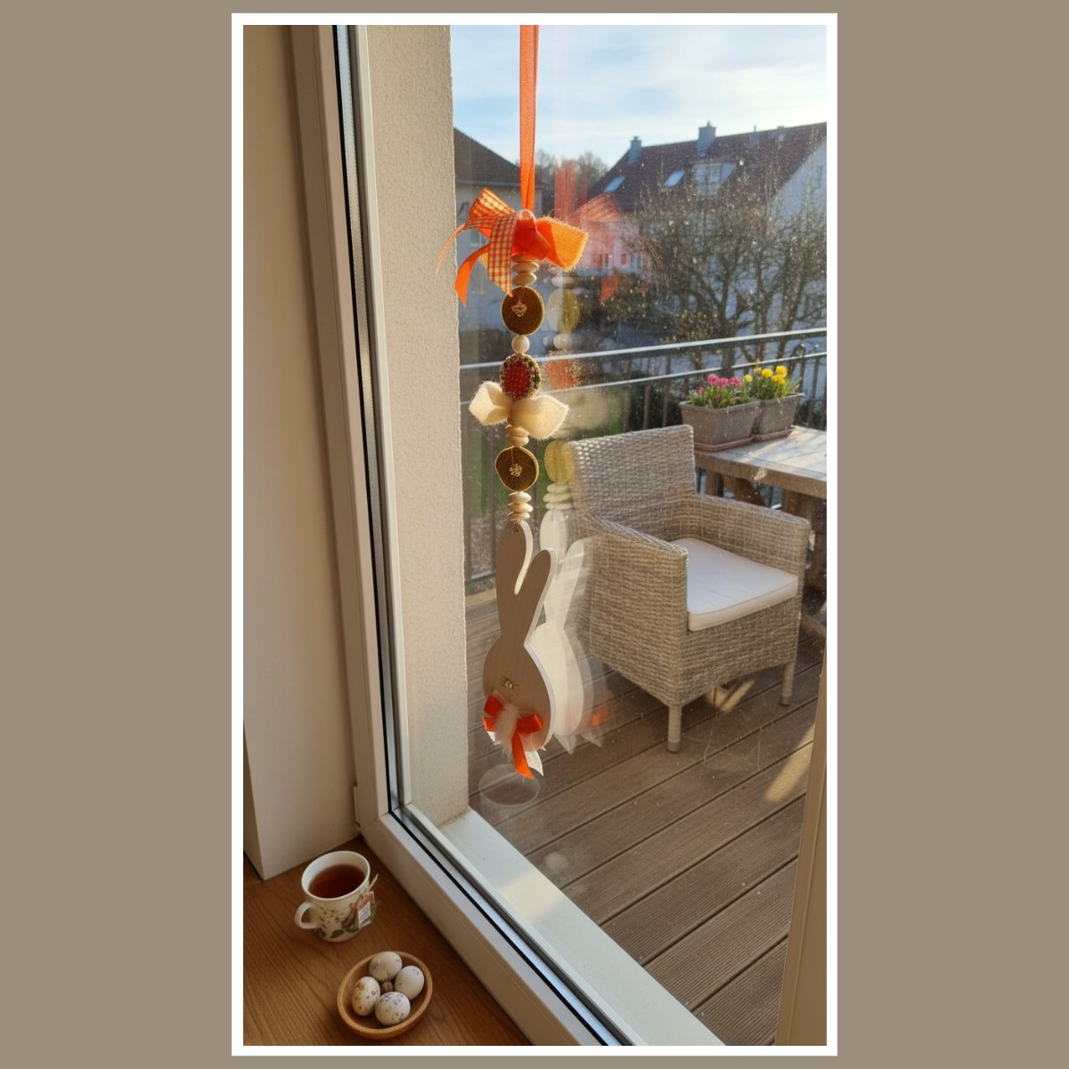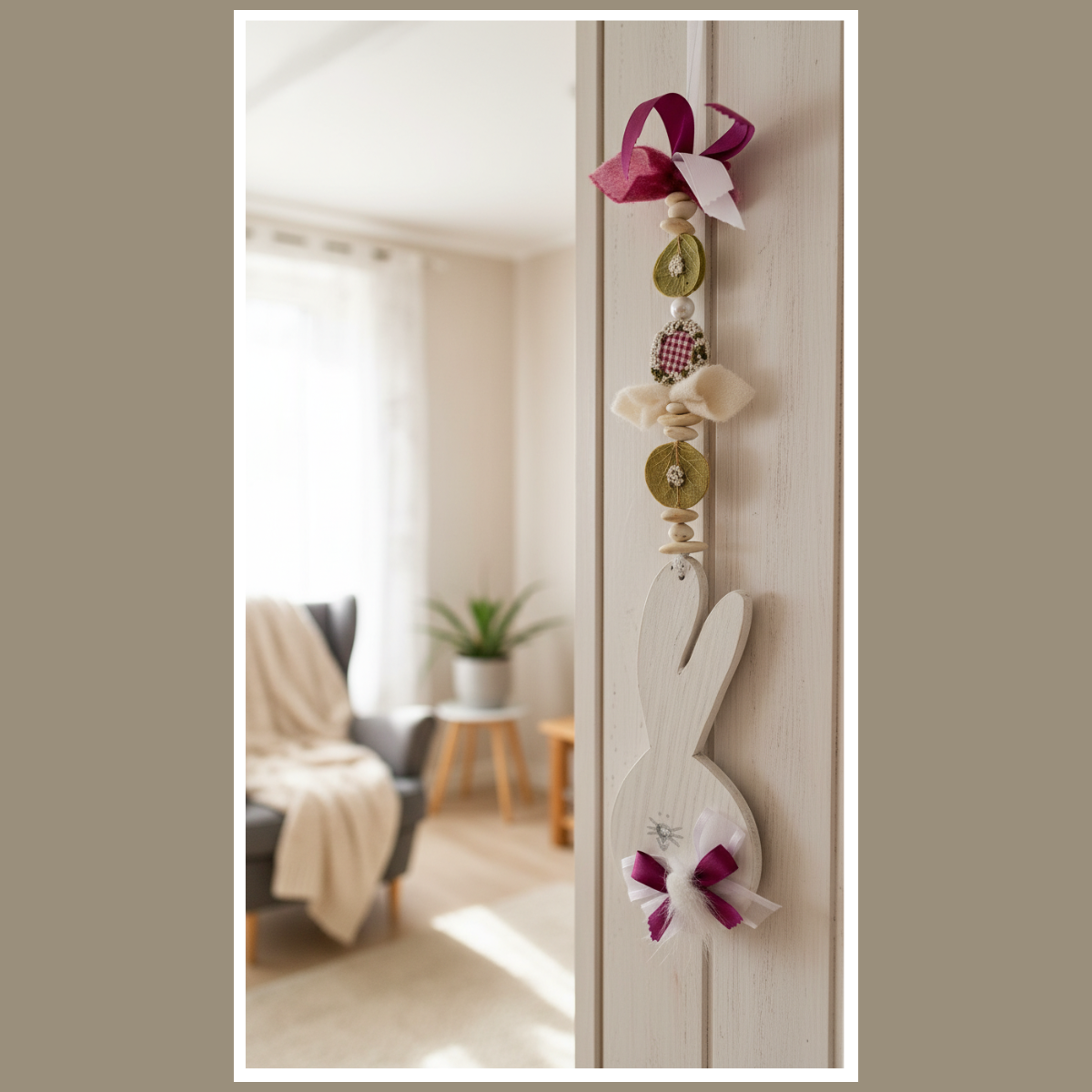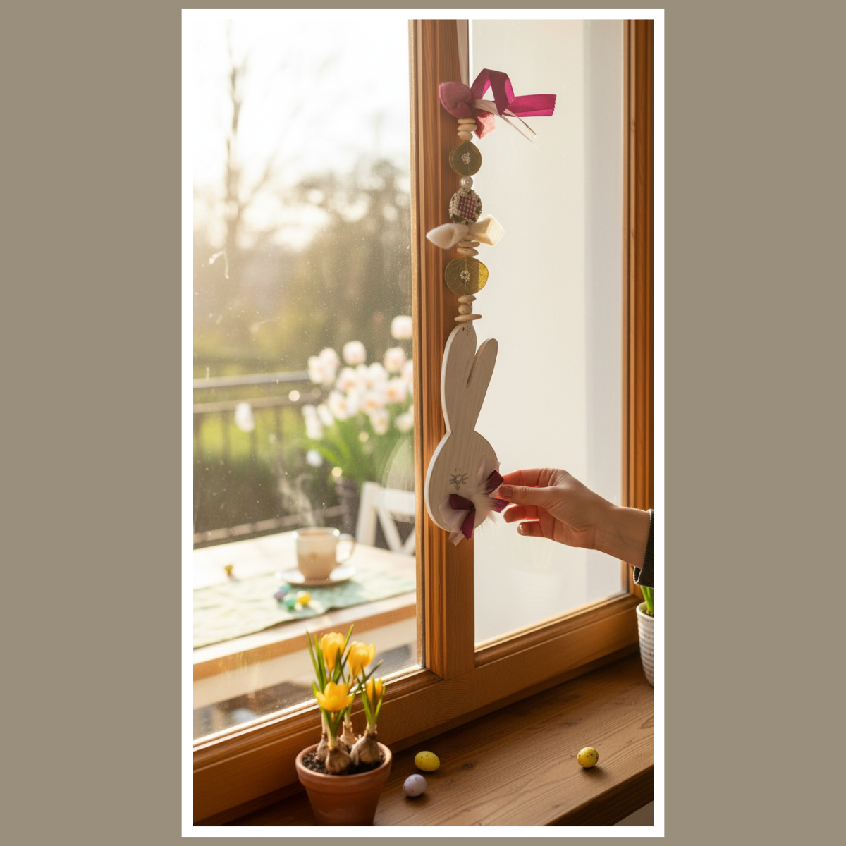 W tej dekoracji główną rolę gra drewniany zajączek. Towarzyszą mu koraliki, elementy drewniane oraz miękkie dodatki. Dzięki temu całość wygląda przytulnie. Co więcej, ozdoba pięknie pracuje w świetle, gdy wisi przy oknie.