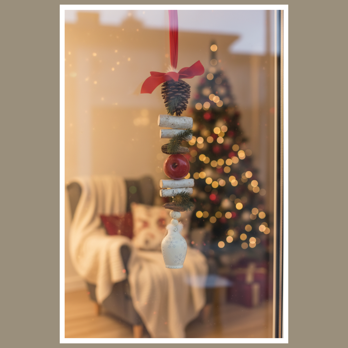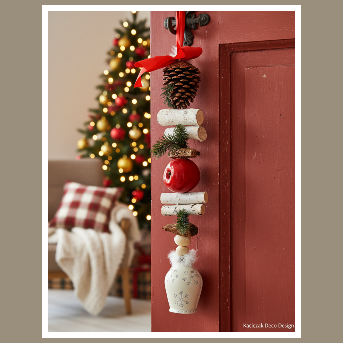 To połączenie klasyki z naturą – intensywna czerwień dzwonu pięknie kontrastuje z naturalnymi dodatkami oraz ozdobnym jabłkiem, które dodaje całości uroku i przytulności.